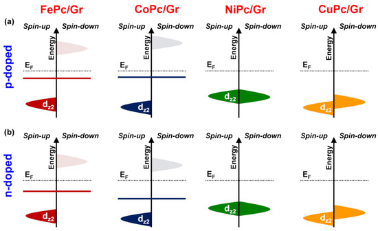 Energy alignment of the metal dz2 orbital for the four (a) p-doped and (b) n-doped MPc/Gr interfaces. All systems are aligned with respect to the Fermi level (EF), with spin-up and spin-down components shown separately on the left and right sides, respectively. Occupied and unoccupied orbitals are represented by solid and dashed areas, respectively. For FePc/Gr and CoPc/Gr, the dz2 centroid is indicated by a solid line, while for NiPc/Gr and CuPc/Gr, the centroid corresponds to the spin-up and spin-down orbital components due to negligible or absent spin polarization on the metal d-states and is not explicitly shown.