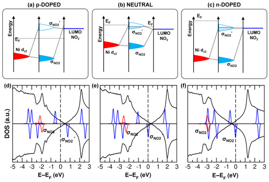(a–c) Schematic representation of the orbital mixing for the NO2-NiPc/Gr system (as shown in Figure 2d) in the p-doped (a), neutral (b), and n-doped (c) cases. The orbital alignment in the schematic representation is based on the projected density of states (PDOS) for Gr (black curve), the NO2 molecule (blue curve), and the Ni dz2 orbital (red curve), as shown in (d–f) for the interacting system, and on the alignment with respect to the vacuum level for each non-interacting fragment (NO2 and NiPc/Gr).