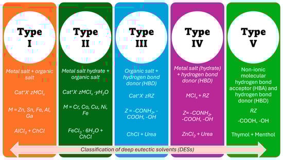 The general formula of DESs is Cat+X−zY, where Cat+ is ammonium, phosphonium or sulfonium cation, X− is the halide anion, usually Cl−, and Y refers to the Lewis or BrØnsted acid that makes a complex with the anionic species; z is associated with the number of Y molecules that are involved in complexation of anion. DESs can be categorised into five types depending on the complexing agent, as summarised in Figure 1 [28,29]. DES type I is formed by a mixture of ChCl (or other quaternary ammonium salts) with an anhydrous metallic salt, for instance ZnCl2 [33]. It is similar to the well-investigated chloroaluminate imidazolium melts or chlorozincate imidazolium melts, which are traditional ILs. When hydrated metal halides were used, the eutectic mixture was classified as type II [34]. It was found that a wide variety of mixtures of choline chloride with hydrated salts (CrCl3⋅6H2O, CaCl2⋅6H2O, CoCl2⋅6H2O, LiNO3⋅4H2O or Zn(NO3)2⋅4H2O) form these DESs.