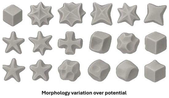 Gold nanoflowers (Au NFs) and nanocrystals (Au NCa) have been successfully obtained from ChCl: Urea (1:2 molar ratio) using electrochemical routes. Nguyen et al. reported the electrochemical synthesis of Au NFs on a glassy carbon (GC) electrode by cyclic voltammetry (CV) within the potential range from −0.6 V to + 0.8 V (vs. Ag/AgCl) at a scan rate of 50 mV/s for 15 cycles using a DES based on ChCl: Urea with 5 mL of 50 mM HAuCl4 as electrolyte. The density and size uniformity of the AuNFs increased with increasing electrolyte temperature (40, 50, and 60 °C) due to enhanced reduction rates and accelerated nucleation at higher temperatures. The Au NFs-modified FC electrode exhibited remarkable performance as a label-free electrochemical DNA sensor for M. tuberculosis detection, achieving a sensitivity of 294.9 Ω nM−1 cm−2 and 218 µA nM−1 cm−2, and a limit of detection (LOD) of 10−9 M. The results demonstrate that DES is an environmentally friendly, low-cost, chemically stable, and biocompatible solvent in nanomaterials synthesis [61]. Wei et al. investigated the overpotential-dependent shape evolution of gold nanocrystals (Au NCs) electrodeposited on a GC electrode from a ChCl: urea DES electrolyte containing 24.28 mM HAuCl4. The potential ranged from −0.5 V to −0.95 V (vs. a Pt quasi-reference electrode). It led to a morphological evolution sequence from concave rhombic dodecahedra (RD) to concave cubes, octopods, cuboctahedral boxes, and finally to hollow octahedra (OH). This study demonstrated that urea molecules play a key role in shaping Au NCs, as they preferentially adsorb on the faces of seeds, blocking their growth. The morphology-dependent electrocatalytic performance of these Au NCs was evaluated for D-glucose electrooxidation, where concave rhombic dodecahedra (RDs) and concave cubes exhibited superior activity at lower potentials. In comparison, octopods and hollow octahedra became more efficient at higher potentials. In this work, the potential of DES is demonstrated as a powerful medium for shape-directed, surfactant-free nanocrystal synthesis [62]. Figure 2 presents a schematic representation of the shape evolution in response to potential change.