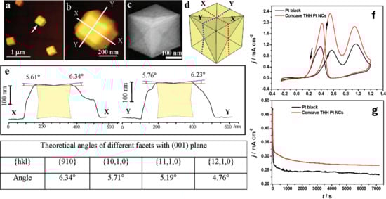 (a) Typical AFM images of concave THH Pt NCs in Figure 4a. (b) Magnified AFM image of concave THH Pt NCs indicated by the white arrow in (a). (c) SEM and (d) model images of a concave THH Pt NCs. (e) Cross-sectional profiles through white lines XX and YY in image (b), showing the XX and YY cross-sectional surfaces and the angles between concave facets and the (001) plane. (f) Cyclic voltammograms (50 mV s−1) and (g) chronoamperometric curves, measured at 0.45 V (vs. SCE), of ethanol oxidation on concave THH Pt NCs (red line) and commercial Pt black catalyst (black line) in 0.1 M ethanol + 0.1 M HClO4 solution. Reproduced with permission of Wei et al. [67]. Copyright © 2012, American Chemical Society.