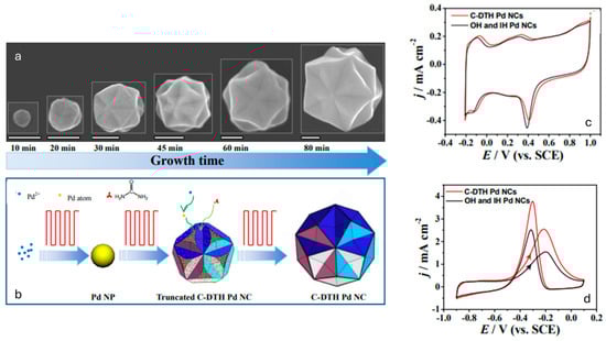 (a) SEM images of Pd NPs electrodeposited on GCE for different times, showing the growth process of C-DTH Pd NCs. Scale bars are 100 nm. (b) Schematic illustration of the proposed growth mechanism of C-DTH Pd NCs. Cyclic voltammograms recorded with C-DTH Pd NCs (red line) and a mixture of OH and IH Pd NCs (black line) in 0.1 M HClO4 solution (c) and 0.1 M ethanol + 0.1 M NaOH solution (d), respectively. Cyclic voltammograms were recorded at room temperature and a scan rate of 50 mV s−1. Reproduced with permission of Wei et al. [68]. Copyright © 2012, American Chemical Society.