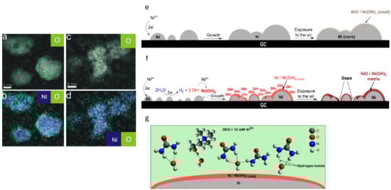 EDX map results for Ni deposited for 60 s at (a,b) E = −0.9 V and (c,d) E = −1.1 V. (a,c) The overlay between the HAADF image and O map. (b,d) The overlay between the Ni map and the O map. Scheme of the electrochemical processes occurring at (e) R1 and (f) R2. (g) Hydrogen bonds formed between hydroxides and DES components (urea and choline chloride). Reproduced with permission of Cherigui et al. [74]. Copyright © 2017, American Chemical Society.