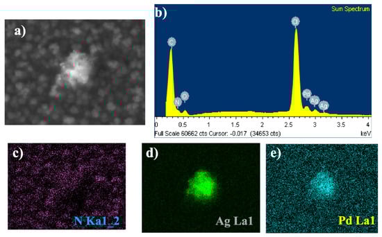 (a) SEM image of one of the Pd–Ag ANPs, (b) EDX spectrum and elemental mapping of (c) N Ka1, (d) Ag La1, and (e) Pd La1. Creative Commons Attribution 4.0 International License [84].