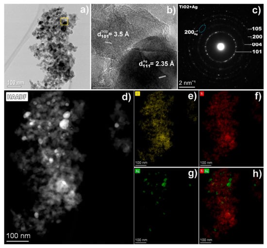 (a) TEM and (b) HRTEM image of Ag-TiO2–3 h composite, showing Ag particles on top of TiO2 (region marked with yellow square in (a)); (c) SAED pattern corresponding to the TEM image (a). (d) low-magnification HAADF-STEM image and EDS mapping showing the O (e), Ti (f) and Ag (g) distribution. (h) superimposed maps of Ti and Ag. Reproduced with permission of Pectu et al. [93]. © 2025 The Authors. Published by Elsevier B.V.