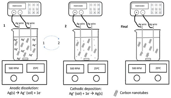 - Brandão, A.T.S.C.; Rosoiu, S.; Costa, R.; Silva, A.F.; Anicai, L.; Pereira, C.M.; Enachescu, M. Dispersion Stability of MWCNTs Decorated with Ag Nanoparticles through Pulse-Reversed Current Electrodeposition Using a Deep Eutectic Solvent. Mater. Proc. 2022, 9, 29. [Google Scholar]