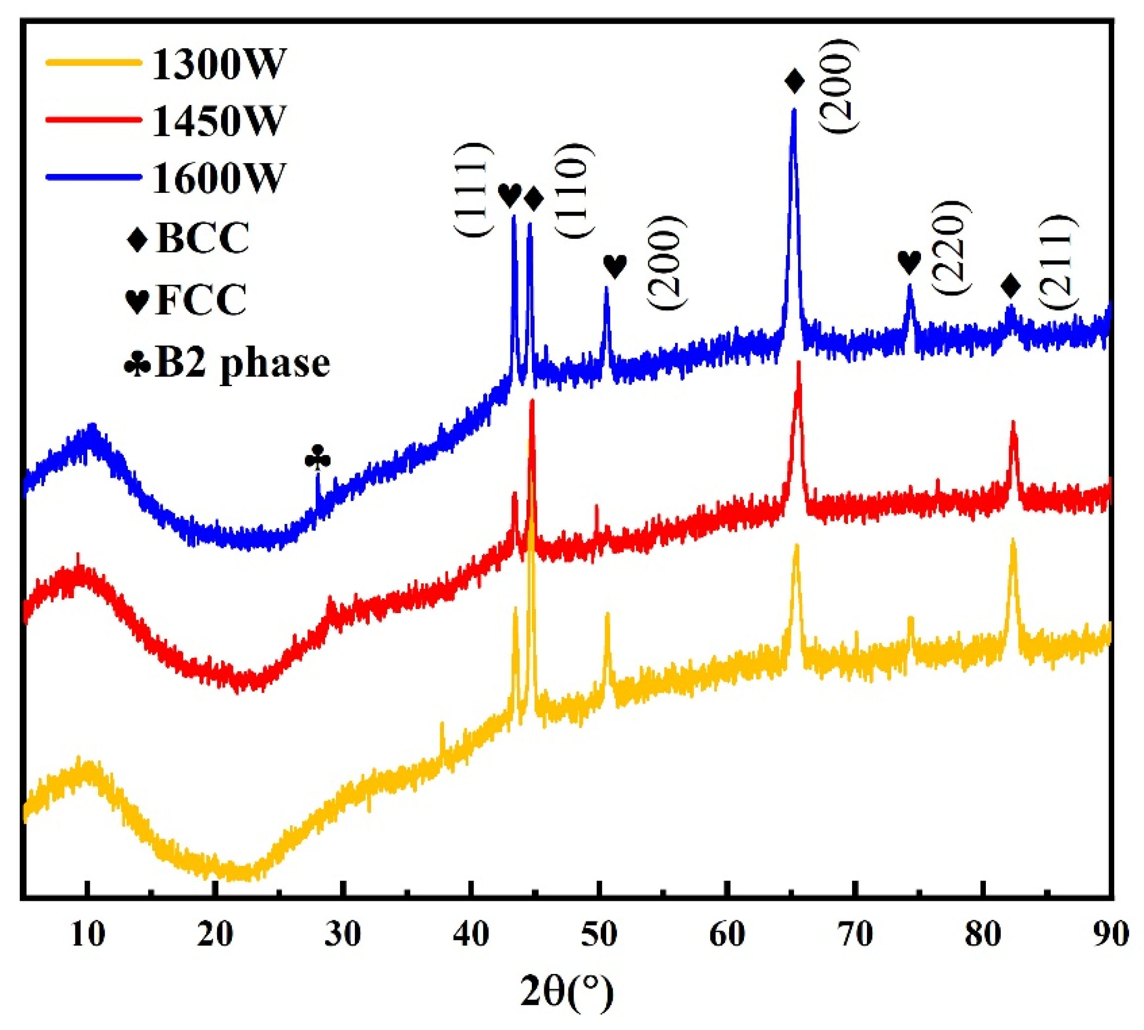 Figure 2 illustrates the XRD patterns of bulk AlCoCrFeNi HEA prepared under different laser power conditions. The XRD characterization results indicate significant phase evolution of the AlCoCrFeNi HEA with varying laser powers. Under the 1300 W laser power condition, the diffraction peaks are broad and exhibit additional superlattice reflections, suggesting that insufficient energy input and slower cooling rates lead to substantial ordering and the formation of the B2 (ordered BCC) phase. At 1450 W, the dominant phase is identified as the BCC solid solution, characterized by strong and sharp diffraction peaks, indicating good crystallinity and a relatively stable solid solution structure. At 1600 W, both enhanced FCC peaks and residual B2 peaks are observed, signifying that the higher energy input modifies the composition and solidification kinetics (including local evaporation, chemical segregation, and rapid solidification capture), ultimately resulting in a complex microstructure with coexisting BCC, FCC, and B2 phases. Overall, the experimental results align with the thermodynamic and electronic structure trends indicated by previously obtained values of δ = 5.44%, ΔHmix = −14.24 kJ/mol, and VEC = 7.20, demonstrating that the alloy resides in the coexistence zone of FCC and BCC phases and possesses a clear driving force for ordering.