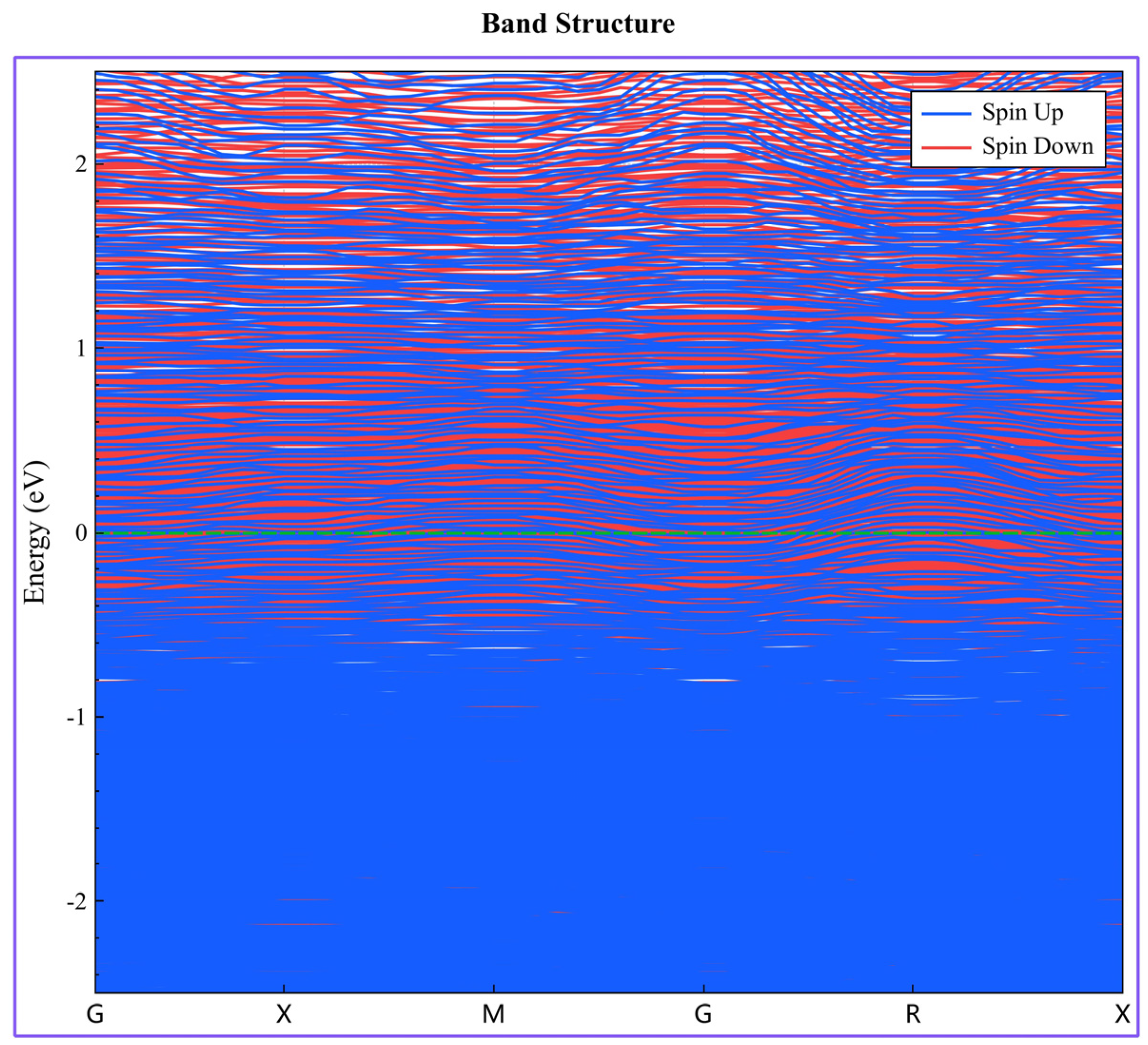 Figure 4 illustrates the energy band structure of the AlCoCrFeNi HEA along the highly symmetric directions of the Brillouin zone. The green dotted line in the figure indicates the position of the Fermi energy level. The energy band structure of the AlCoCrFeNi HEA reveals that the Fermi level intersects multiple energy bands, confirming the absence of a band gap and indicating typical metallic behavior with high electrical conductivity. The continuous distribution of energy bands across high-symmetry points in the Brillouin zone reflects the free mobility of electrons, further supporting the alloy’s metallic nature. At the Fermi level, the electronic states are primarily influenced by the d-orbitals of Fe, Co, and Ni, which contribute significantly to metallic bonding and conduction, while the s–p orbitals of Al, although contributing less directly to conductivity, play a crucial role in regulating the electronic structure and stabilizing the overall phase. This electronic configuration not only elucidates the strong metallic bonding of the system but also supports the experimentally observed coexistence of the BCC, the FCC, and B2 phases, as the high density of states near the Fermi level provides the driving force for structural competition and ordering. Therefore, the energy band structure analysis demonstrates that the AlCoCrFeNi HEA inherently possesses strong metallic characteristics and complex phase stability, consistent with thermodynamic and experimental observations.