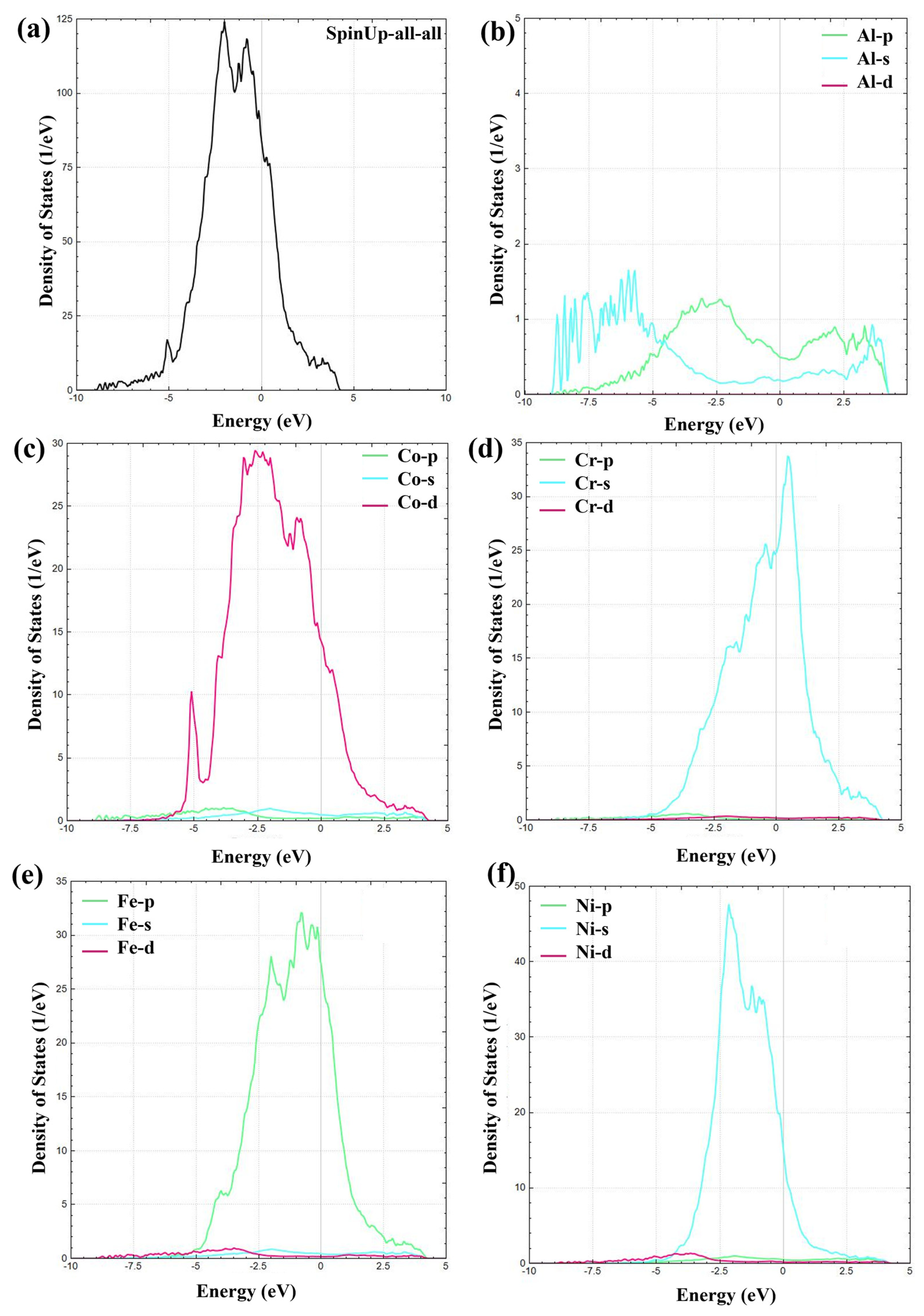 Figure 5. The total and partial density of states of AlCoCrFeNi HEA: (a) AlCoCrFeNi HEA; (b) Al; (c) Co; (d) Cr; (e) Fe; (f) Ni.