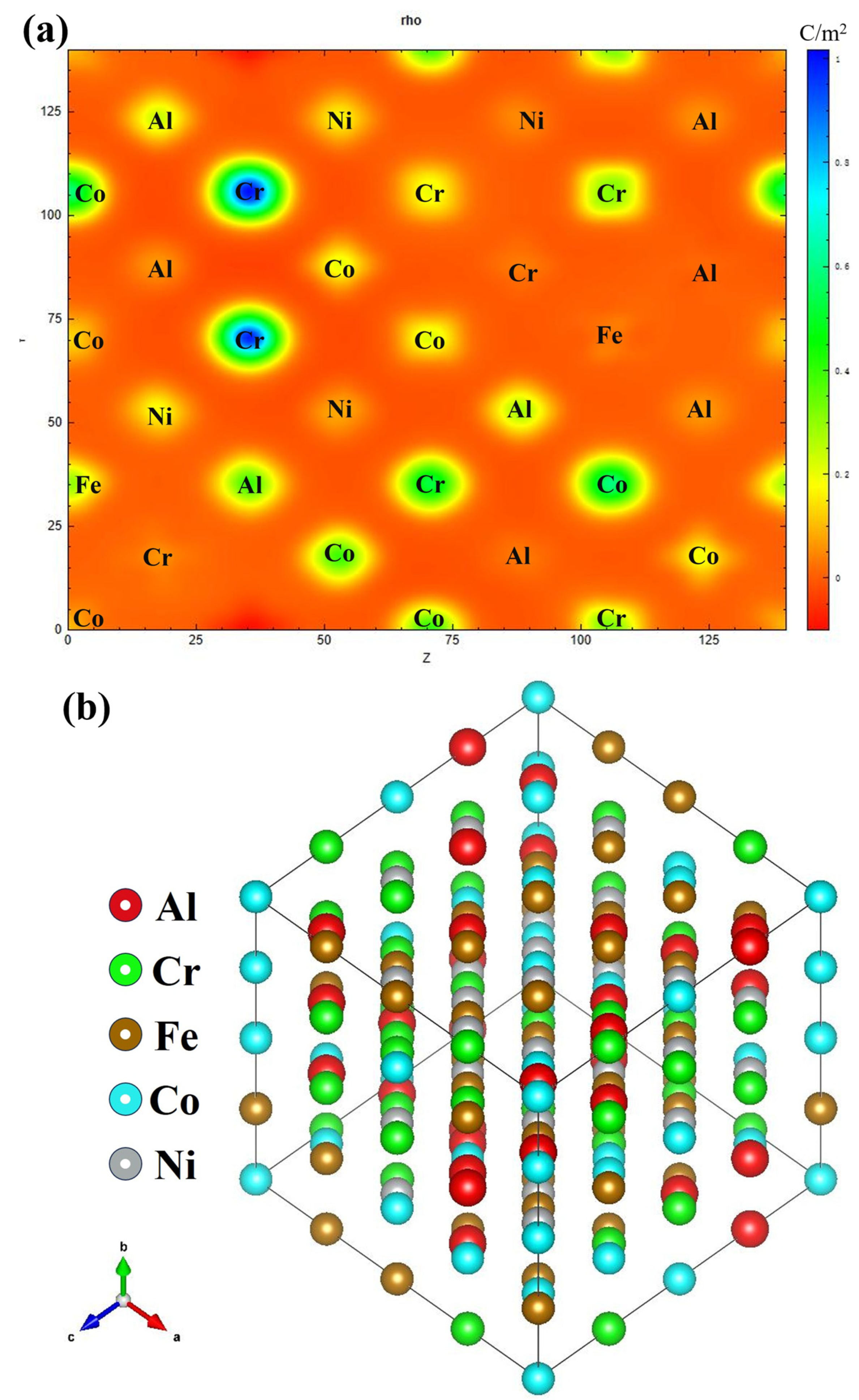 Figure 6. (a) The charge density, (b) the charge density difference diagram of AlCoCrFeNi HEA along crystal plane (110).