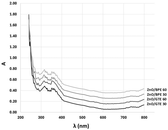 Applying UV–vis spectrometry, absorption spectra were studied and the bandgaps of ZnO/BPE and ZnO/GTE powders were calculated for synthesized powders and deposited films. The procedure and methods of band gap determination via Tauc’s plots are described in Section 2.3.