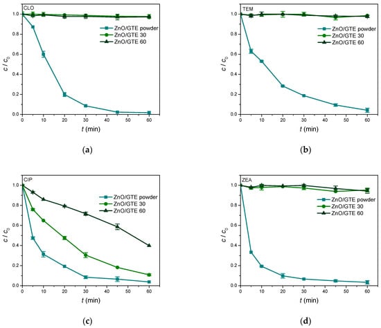 Figure 6. Comparative photocatalytic degradation of (a) CLO; (b) TEM; (c) CIP (0.05 mmol/dm3); and (d) ZEA (0.5 μg/cm3) in the presence of ZnO/GTE 30 and ZnO/GTE 60 coatings under SSI.
