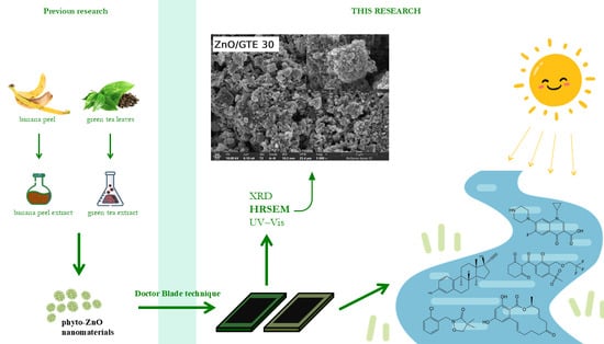 Bearing in mind the sustainability of heterogenous photocatalysis, the aforesaid drawbacks of ZnO have to be improved. Thus, a great attention is paid to the fabrication of novel, bio-inspired ZnO materials appreciating the principles of nanotechnology [28]. Nanotechnology involves the synthesis, characterization, and investigation of materials within the nanometer range (1–100 nm), where the properties and functions of both natural and engineered systems are defined [29]. Various approaches exist for the synthesis of nanomaterials, which can be broadly categorized into physical, chemical, and biological methods. However, for the purpose of leaving the harmful organic chemicals and non-sustainable experimental conditions aside, green and feasible methods, relying on the usage of various plant extracts as an alternative, should be developed [30]. The role of plant extracts is primarily to reduce metal salts, and to cap and stabilize particles of a new nanomaterial [28]. However, when it comes to the application of various, bio-inspired nanomaterials in photocatalysis, there is another problem, which has to be considered and solved. Namely, after the photocatalytic treatment, the used powder-based catalyst has to be removed and regenerated for further application, which represents an additional problem for scaled-up heterogeneous photocatalysis [31]. Thus, currently, the up-to-date studies are focused on immobilizing the photocatalytic nanomaterials on different substrates or supports to achieve better efficiency and enhance the practical implementation of photocatalysis technology, for instance, by coating TiO2 or ZnO onto various surfaces using techniques such as dip coating, spin coating, spray pyrolysis, pulsed laser deposition (PLD), and electrophoretic deposition (EPD). Examples include the following: (i) TiO2/Ag composites immobilized on fluorine-doped tin oxide (FTO) glass via spin coating with silica binders, (ii) ZnO nanostructures deposited on sapphire substrates using PLD for the enhanced photocatalytic degradation of organic dyes, and (iii) TiO2 films fabricated by EPD on stainless steel or glass substrates, which demonstrated improved photocatalytic performance after sintering [32,33].