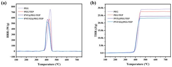(a) The HRR curves of PEG, PEG/TEP and PNT/S2@PEG/TEP, respectively; (b) The THR curves of PEG, PEG/TEP, PNT@PEG/TEP and PNT/S2@PEG/TEP, respectively.