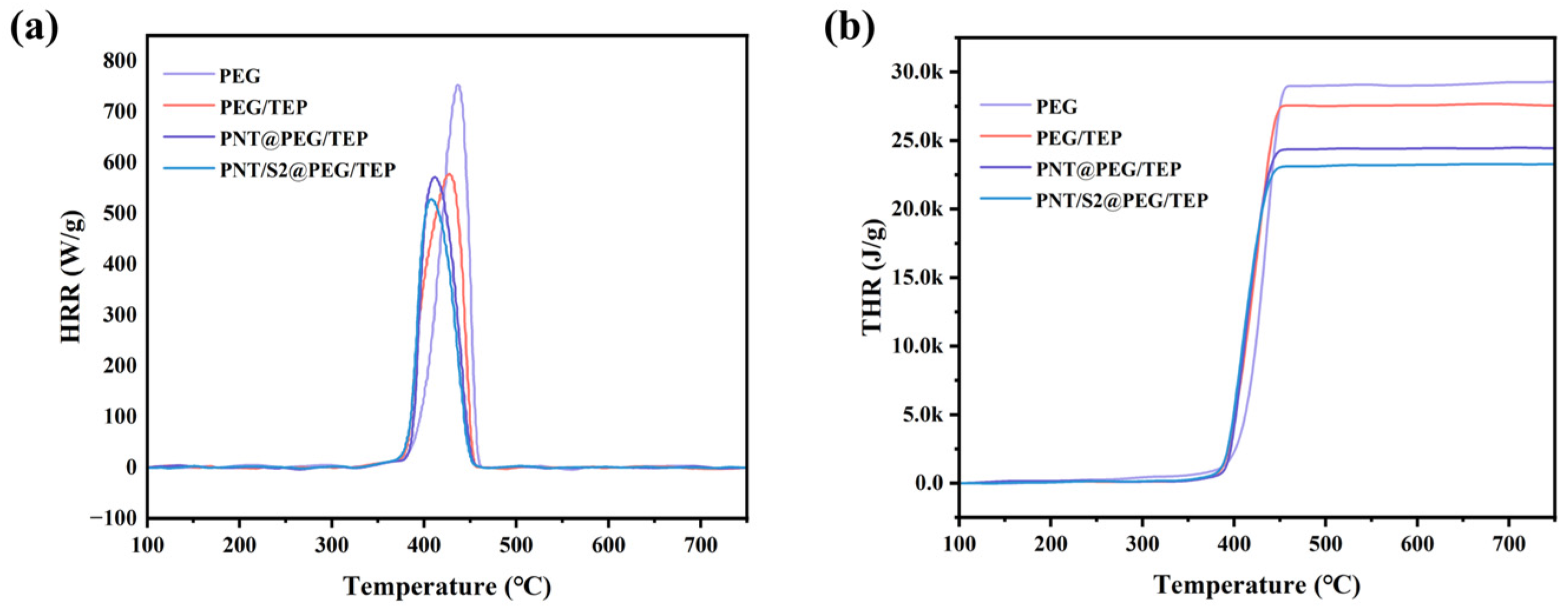 | Sample | HR (J/g·K) | HRR (W/g) | THR (kJ/g) | Temperature (°C) |