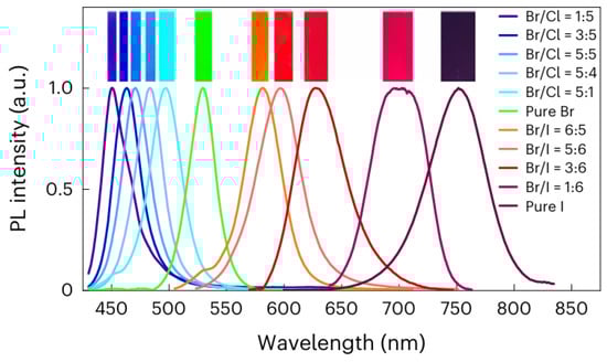 Perovskite crystals and PTFs, with the general formula of ABX3, emerged as a transformative class of materials in optoelectronics due to their exceptional properties and low-cost fabrication. These materials crystallize in cubic, tetragonal, or orthorhombic structures, exhibiting high absorption coefficients (greater than 105 cm−1), long charge carrier diffusion lengths (greater than 1 µm), and tunable bandgaps (1.2–3.0 eV) via halide substitution [25,26,27]. Additionally, they demonstrate high PLQY (>90%) in optimized films, making them ideal for PeLED applications. PTFs, typically deposited using solution-based methods such as spin coating or vapor phase deposition techniques, have enabled the remarkable progress in photovoltaic efficiency, with PSCs now exceeding a 26% power conversion efficiency (PCE), rivaling traditional silicon-based technologies [28]. Significant progress was made through innovations in material composition (e.g., mixed cations such as Cs+/FA+/MA+ for enhanced stability and device performance), interfacial passivation (using molecular additives to suppress defects), and fabrication techniques [29]. Additionally, by substituting the halide elements within the perovskite and formulating ink with varying halide ratios, emitters covering the entire Vis spectrum also enhance their efficiency, as shown in Figure 3 [29]. A notable example is the triple cation Cs/FA/MA, Pb(I/Br)3 PSCs, which showed 25.7% PCE and retained 80% efficiency after one thousand hours of operation, highlighting improvements in both performance and durability.