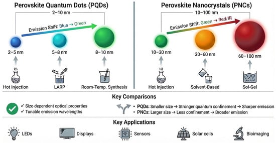 The optical properties of perovskite materials are highly dependent on their particle size, which can be precisely controlled with different synthesis techniques. Size control is essential for tuning the emission wavelength and optimizing the material performance for specific applications, such as LEDs, SCs, and displays. For instance, PQDs with size ranging 2–10 nm exhibit the quantum confinement effects that cause tunable emission, shifting from blue to green as the size increases, as shown in Figure 7. In contrast, PNCs of size ranging from 10 to 100 nm show broader emission spectra, with a shift from green to red/infrared, reflecting the reduced confinement in larger particles. Synthesis techniques, such as the hot-injection method, RT synthesis, and the sol–gel method, provide precise control over particle size, influencing both absorption and emission properties and ultimately enhancing the performance of perovskite-based devices.