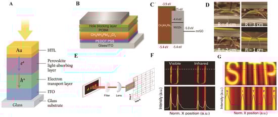 To further improve the performance of the device, researchers have explored the incorporation of QDs into PTFs. As illustrated in Figure 9A, introducing MAPbBr3−xIx QDs into the perovskite absorber establishes a stepwise hole-transfer pathway that surpasses recombination and enhances current density and PCE. The corresponding device layout, shown in Figure 9B, consists of transparent conducting oxide, a compact electron-transport layer, the perovskite absorber with an interfacial or mixed-QD layer, hole-transport materials, and a metal electrode. This QD layer not only provides energy-level alignment but also improves device stability, particularly when inorganic CsPbI3 QDs are used [102]. The energy-level diagram in Figure 9D, however, shows how QDs form cascade alignment between the perovskite valence band and the hole transport material, accelerating charge extraction and reducing recombination losses. Such improvements lead directly to higher open-circuit voltage and enhanced device efficiency [103].