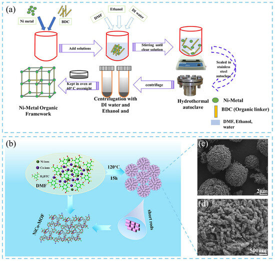 Schematic illustration of (a) the synthesis procedure of Ni-MOFs via one-pot solvothermal method [13], and (b) solvothermal synthesis of Ni, Co-MOF. (c,d) Morphological observation of Ni, Co-MOF-3 [15].
