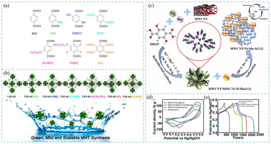 (a) BDC-type organic ligands used for the modulated hydrothermal synthesis (MHT) of UiO-66 MOFs. (b) Different UiO-66 MOFs obtained by the MHT method [16]. (c) Hydrothermal synthesis of MOF-74-Ni/Mn (3:2) and sulfurization process for preparing MWCNT/Ni–Mn–S (3:2) composite material. Electrochemical performance measurements for MWCNT/Ni-Mn-S composite electrodes. (d) CV curve at 10 mV s−1, and (e) GCD curve at 1 A g−1 of MWCNT/Ni–Mn–S [17].