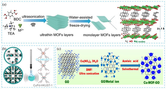 Schematic diagram of (a) ultrasonication-assisted synthesis of 2D Ni-MOF nanosheets [18], (b) structure of Cu-HKUST-1 and CuPd-HKUST-1 synthesized via ultrasound technique [20], and (c) ultrasound-assisted method for synthesis of size-controlled Cu-MOF-GO composite [21].