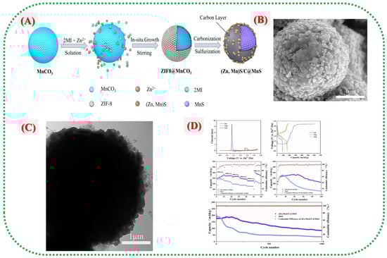 Manganese-based metal–organic frameworks (Mn-MOFs) and their derivatives offer a promising approach to address common issues with traditional Mn-based cathodes in water-based Zn-ion batteries (ZIBs), including poor conductivity, dissolution, and slow ion transport. MOFs can be converted into functional composites, such as sulfides, oxides, and carbon-coated hybrids. This method enables the development of well-structured, porous architectures and conductive networks that enhance ion transport while maintaining structural stability during battery cycling. Wang et al. [30] developed a heterostructured microsphere composed of (Zn, Mn)S/C-derived MOF coated with MnS ((Zn, Mn)S/C@MnS) to improve the performance of MnS cathodes. The process, shown in Figure 6A), begins with synthesizing MnCO0@ZIF-8 microspheres, followed by carbonization and sulphuration to form a (Zn, Mn)S/C shell around a MnS core. The in situ growth of ZIF-8 and its subsequent conversion into a conductive carbon layer help prevent MnS dissolution and enhance electrical conductivity. Figure 6B,C depict the microstructural evolution from smooth ZIF-8@MnCO3 seeds to rough (Zn, Mn)S/C@MnS microspheres, indicating successful transformation and hollow-shell formation that facilitate Zn+ diffusion. Electrochemical tests in Figure 6D reveal that this composite surpasses other materials, achieving a high specific capacity of 374.1 mAh g−1 at 0.2 A g−1 and maintaining 85.6 mAh g−1 after 1000 cycles at 1 A g−1. These results demonstrate that the MOF-derived carbon layer and heterostructure (Zn, Mn)S interfaces work together to enhance redox reversibility, prevent Mn dissolution, and preserve cathode structural stability during prolonged cycling.