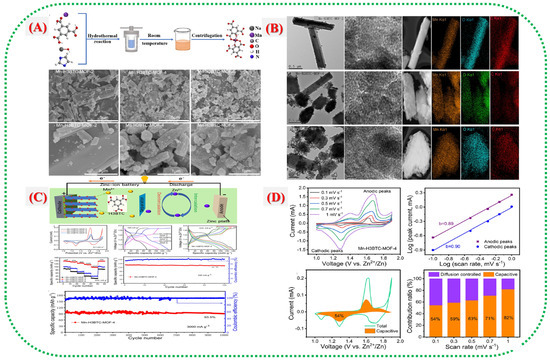 (A) schematic of the synthesis route and Mn(II) coordination in Mn-H3BTC-MOF-4, with SEM images of Mn-H3BTC-MOF-2, -4, and -6. (B) HRTEM images and EDS elemental maps (C, O, Mn) of Mn-H3BTC-MOF-2, -4, and -6 powders. (C) ZIB schematic using MOF cathode and Zn anode; CV curves at 0.1 mV s−1; charge/discharge profiles at 100 mA g−1; rate capability and multi-current performance of Mn-H3BTC-MOF-4. (D) CV curves of Mn-H3BTC-MOF-4 at different scan rates; log(i)–log(v) plots; capacitive versus diffusion contributions; bar chart of capacitive ratios at various scan rates [31].