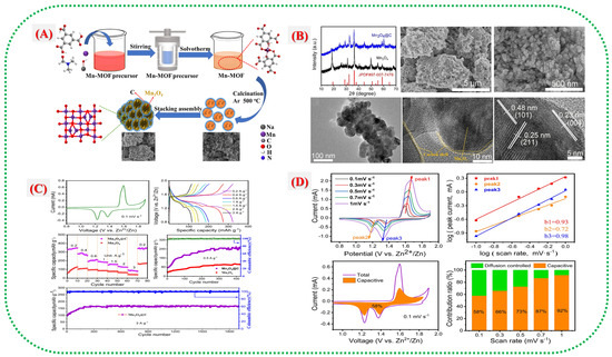 Yin et al. developed a new Mn–MOF composite system (Figure 8A–D) that combines manganese oxide with carbon [31]. These hybrids capitalize on the inherent redox activity of Mn centers and the electrical conductivity provided by the carbon frameworks. Figure 8A depicts a schematic of the transformation of a MOF into a hybrid via solvothermal and carbonization methods. The structural insights in Figure 8B reveal that solid Mn–O phases form within the amorphous carbon network. Electrochemical testing in Figure 8C,D indicates stable charge–discharge cycles, low resistance, and strong rate capability. These promising results arise from the combined benefits of the MOF-derived porous architecture and the conductive carbon matrix. This interconnected framework helps prevent Mn degradation, absorbs structural stress during Zn+ intercalation and deintercalation, and improves cycle stability.