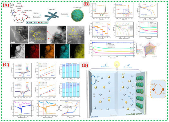 Lu et al. developed a Cu–MOF-derived Cu–MnO@C composite as a high-performance cathode for aqueous Zn-ion batteries, showing that Cu doping, carbon coating, and oxygen vacancy engineering collectively enhance conductivity, stability, and redox kinetics [39]. Their research confirmed that MOF-based methods create a porous structure that significantly improves long-term cycling and Zn2+ intercalation. They detailed the synthesis process in Figure 10A, in which Cu/Mn–MOF precursors undergo static deposition and calcination to produce the composite. In this process, organic ligands break down into conductive carbon, oxygen vacancies form, and Mn2+ is partially replaced by Cu2+. The schematic illustrates how the MOF template enhances electrochemical performance by enabling Cu integration into the MnO lattice while preserving porosity.