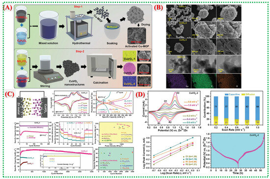 - Kakarla, A.K.; Bandi, H.; Syed, W.A.; Narsimulu, D.; Shanthappa, R.; Yu, J.S. Unraveling Energy Storage Performance and Mechanism of Metal–Organic Framework-Derived Copper Vanadium Oxides with Tunable Composition for Aqueous Zinc-Ion Batteries. Small Methods 2025, 9, 2400819. [Google Scholar] [CrossRef] [PubMed]