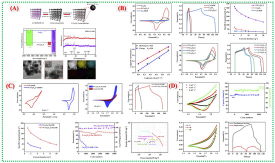 In this study, Ling Qin et al. [56] examine a different MOF-derived composite system, emphasizing how multi-component integration and microstructural control can synergize to enhance electrochemical performance. Figure 15A outlines the formation mechanism, crystallinity confirmation, and uniform element distribution of the composite material, establishing a stable framework conducive to ion transport. Vigorous CV redox activity and GCD features in Figure 15B show improved reversibility and reduced polarization, which are indicative of the optimized internal pathways produced by the MOF-templated structure. Figure 15C provides detailed insights into surface chemistry and electronic states, suggesting that altered oxidation environments, lattice adjustments, or defect-engineered sites contribute to accelerated electron transport and improved reaction kinetics. The story is completed in Figure 15D, which shows device-level superiority, including high specific capacity, excellent rate capability, stable cycling behavior, and reduced impedance, proving that the MOF-derived architecture of the composite continuously promotes fast electrochemical kinetics and structural endurance. Recent reports on Co-MOFs and their derivatives are summarized in Table 3.