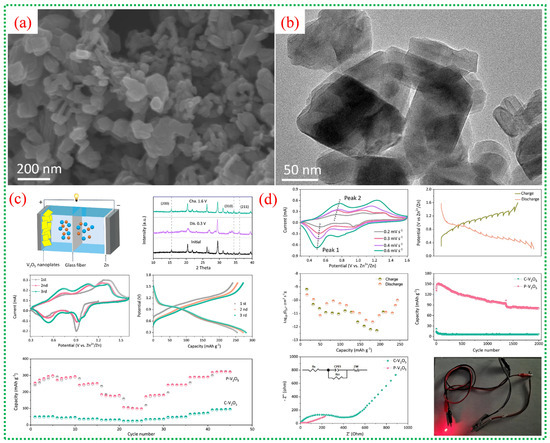 (a,b) reveal that V-MOF-derived V2O5 consists of ultrathin, porous nanoplates, as observed by SEM and TEM, providing numerous active sites and short diffusion paths for Zn2+ ions. (c) presents a schematic of the assembled aqueous Zn//V2O5 battery configuration. XRD analysis of V-MOFs, combined with cyclic voltammetry curves, shows two distinct redox couples corresponding to stepwise Zn2+ insertion and extraction alongside V5+/V4+/V3+ redox transitions. This further confirms a highly reversible Zn2+ intercalation mechanism, as reflected in stable electrochemical behavior and the beneficial effect of mixed vanadium valence states on charge storage kinetics. (d) illustrates that porous V2O5 delivers a substantially higher discharge capacity and lower polarization than commercial V2O5, while also demonstrating excellent cycling stability and Coulombic efficiency [71].