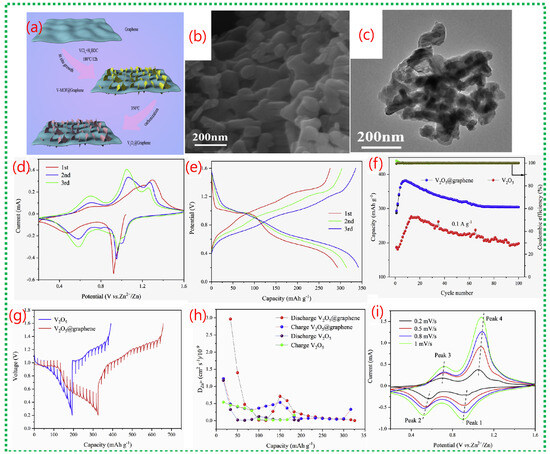 (a) Scheme illustrates the stepwise formation of a two-dimensional hierarchical V2O5@graphene composite. (b,c) show SEM and TEM images confirming that ultrathin V2O5 nanosheets are uniformly anchored on the graphene substrate. (d) presents CV curves with enhanced peak intensity and area, indicating improved Zn2+ storage kinetics due to graphene incorporation. (e,f) reveals higher reversible capacity and superior long-term cycling stability compared to bare V2O5. (i) shows CV curves at different scan rates, while (g) demonstrates b-value analysis, indicating a mixed diffusion-controlled and pseudocapacitive charge-storage mechanism. (h) confirms reduced charge-transfer resistance and stable electrode kinetics during prolonged cycling [71].
