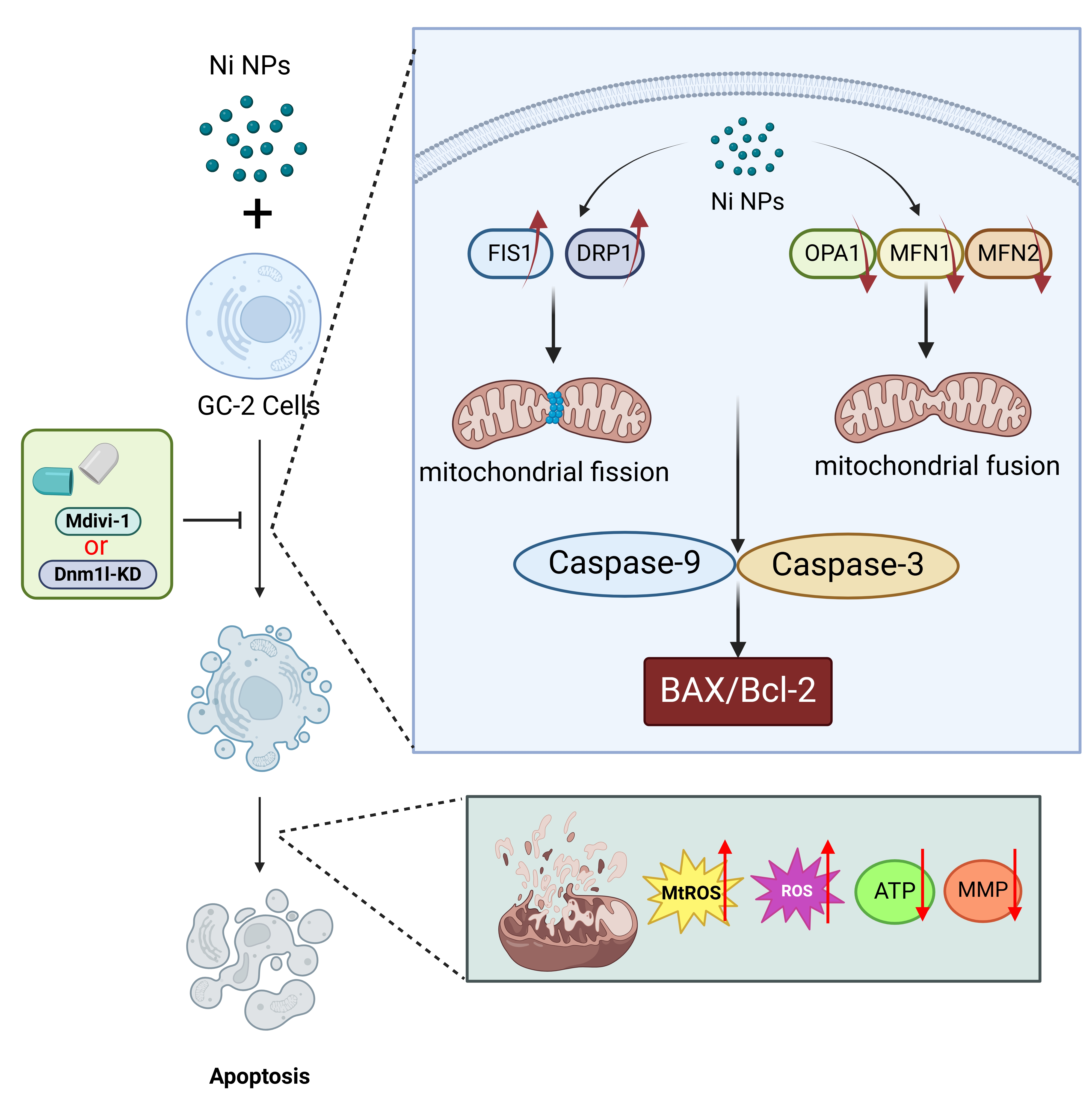 2.14. Optimal Conditions for Mdivi-1 and Dnm1l and Their Reverse Effects on the Ni NPs-Induced Toxicity
