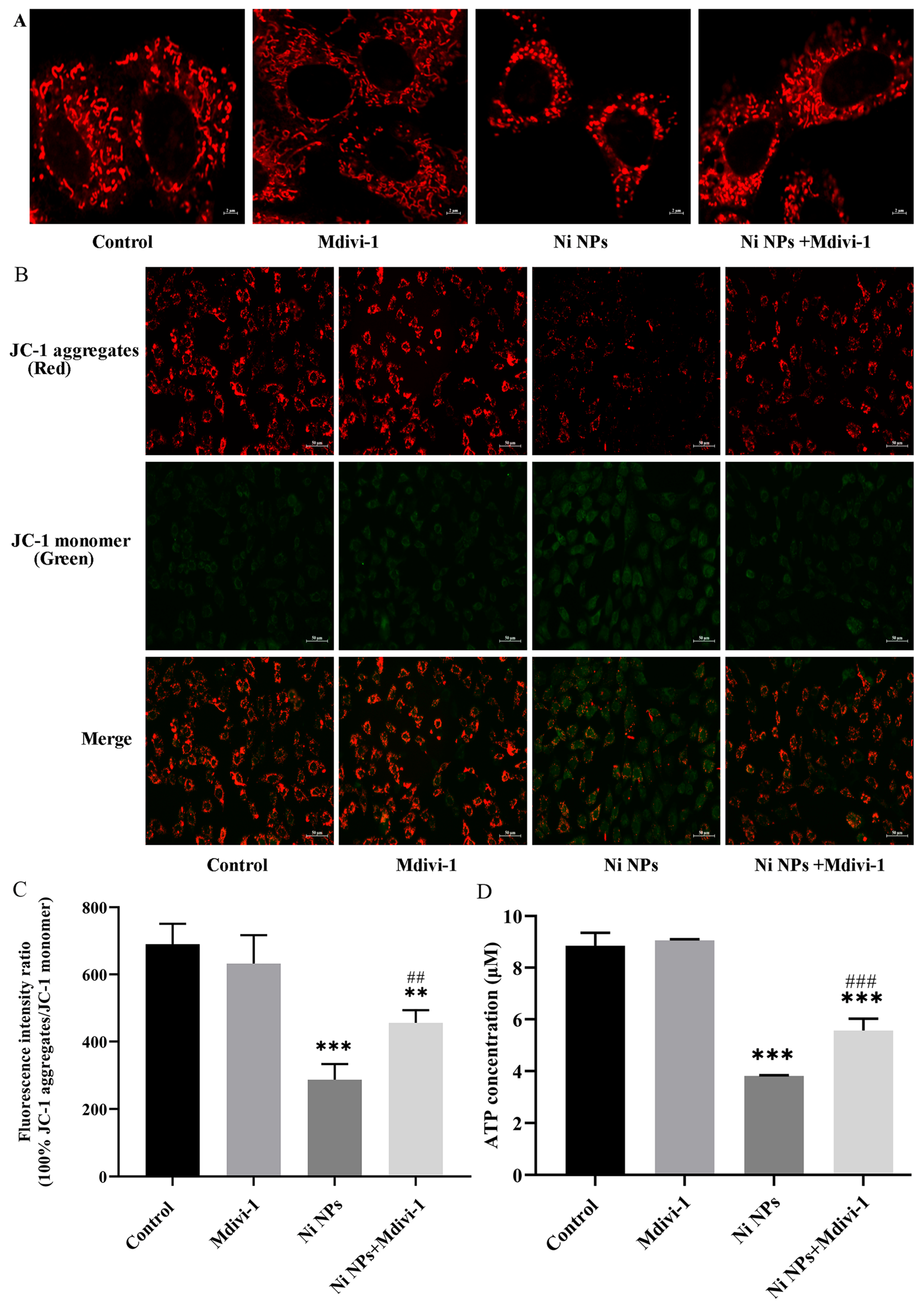 3.2.4. Effects of Mdivi-1 on Mitochondrial Structure and Function Caused by Ni NPs