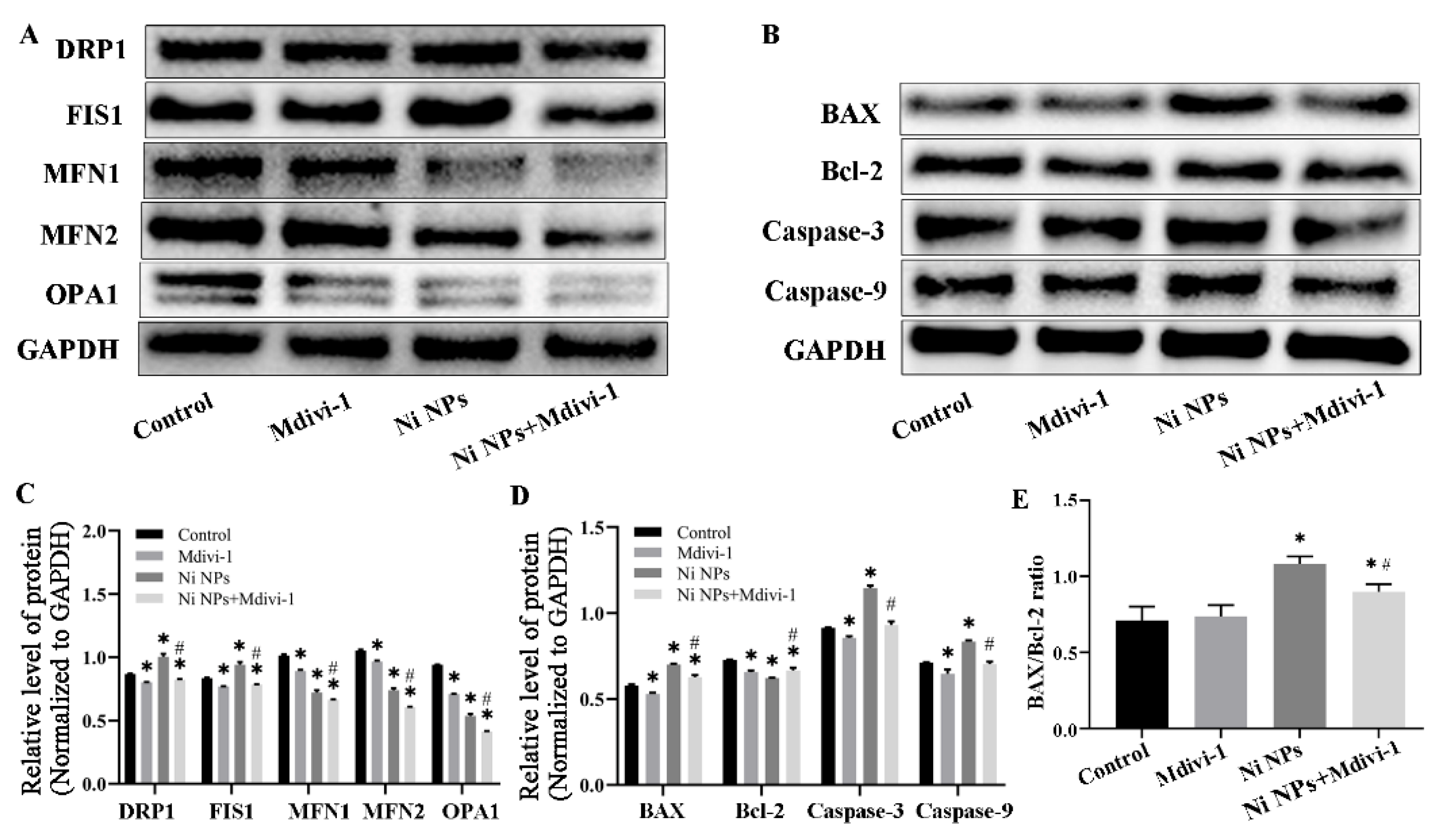 3.2.5. Effects of Mdivi-1 on the Expression of Mitochondria- and Apoptosis-Related Proteins Caused by Ni NPs