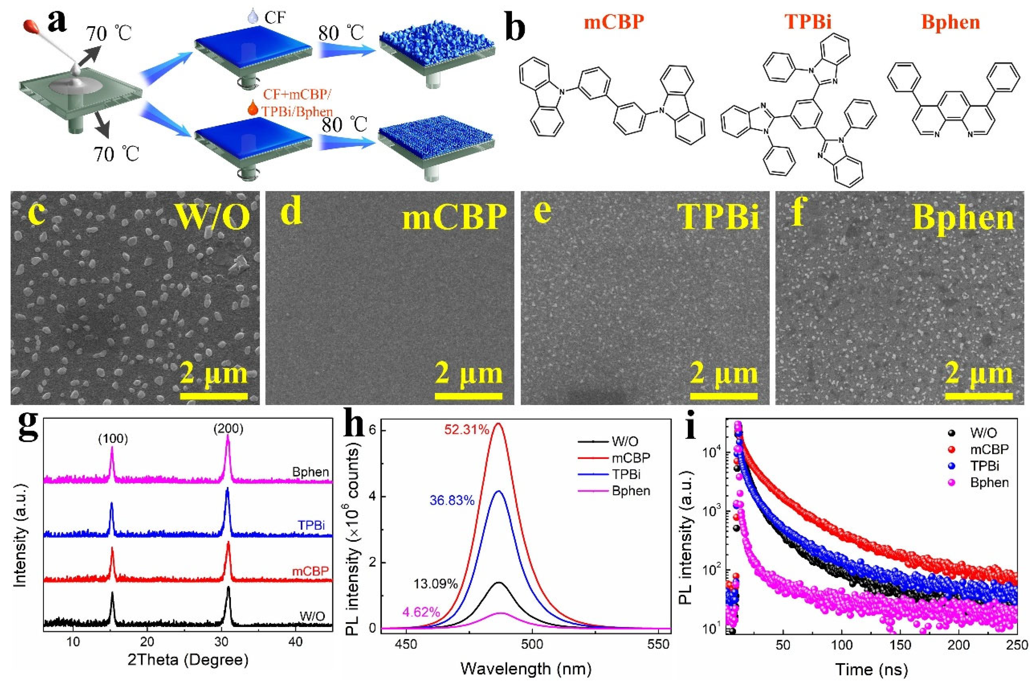Figure 1h, the W/O perovskite film exhibits relatively low PL intensity with an emission peak centered at 484 nm. The introduction of mCBP significantly enhances the PL intensity without shifting the peak position, indicating improved light-emission efficiency. Furthermore, as presented in
