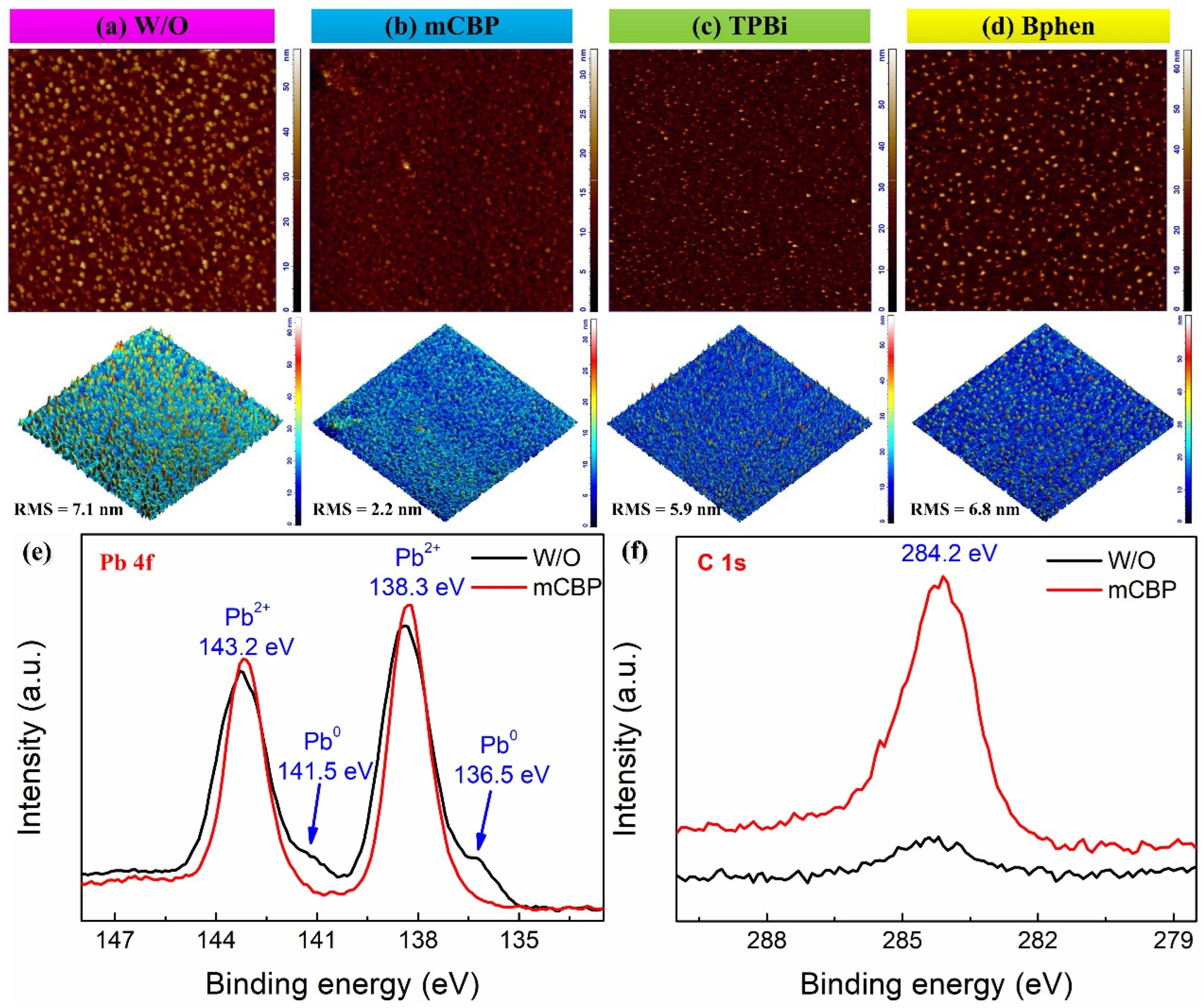 Figure 2e, two additional weak peaks at 136.5 and 141.5 eV associated with metallic Pb disappeared, while the two main peaks at 138.3 and 143.2 eV assigned to the lead bromide/chloride component in perovskite remained almost unchanged, indicating that the cation-π interaction can suppress the formation of metallic Pb and reduce the defect density in the perovskite films. In addition, the higher intensity of C 1s peaks at 284.2 eV derived from more carbon elements further confirmed the doping of the carbon constituting mCBP (