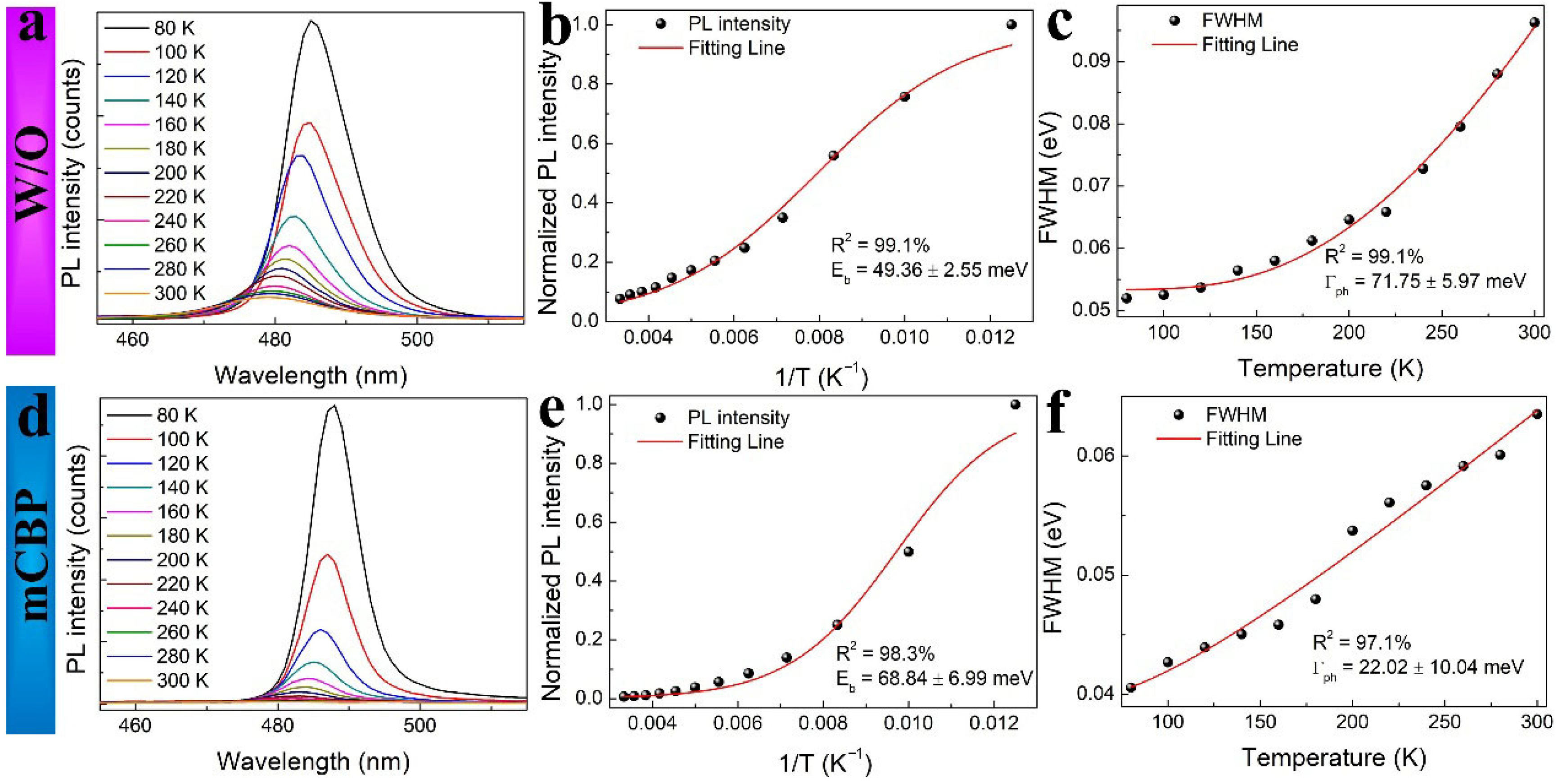 Figure 3a,d, the PL intensity of both untreated (W/O) and mCBP-treated films increases as the temperature decreases, eventually saturating at lower temperatures. The PL intensity was then plotted as a function of inverse temperature (1/