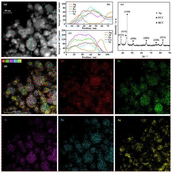 The morphology and elemental analysis data of the AgAlFeCoNi nanoparticles synthesized by the electrically exploding sample 1: (a) TEM image; (b,c) element distribution by line scanning along the green arrows in (a); (d) elemental mappings; (e) XRD pattern.