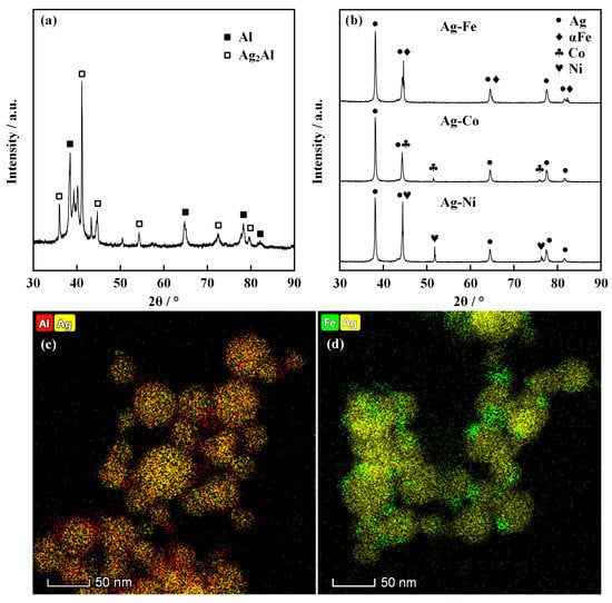 The experimental results of the electrically exploding Sample 1 reveal the occurrence of Ag segregation in the ME-NPs. Since the ME-NPs originate from a mixture of vapor atoms and liquid clusters, the mixing enthalpy plays a crucial role in determining the structural characteristics during the alloy solidification. The significant difference in the atomic size and crystal parameters of metals leads to immiscibility or nearly complete insolubility between elements [24,25]. The high binary mixing enthalpy between Ag and Al, Fe, Co, and Ni promotes a pronounced phase separation [26]. The bimetallic nanoparticles of Ag-Al, Ag-Fe, Ag-Co, and Ag-Ni are synthesized by the electrically exploding twin wires. The XRD data and EDS patterns of the binary nanoparticles are shown in Figure 4. Figure 4a is the XRD data of Ag-Al binary nanoparticles. One can see that the Ag2Al and Al are observable in Ag-Al nanoparticles. Figure 4b demonstrates the XRD data for Ag-Fe, Ag-Co, and Ag-Ni binary nanoparticles. In contrast to the Ag-Al nanoparticles, the intermetallic phase is not detected in Ag-Fe, Ag-Co, and Ag-Ni nanoparticles. The Ag-Fe, Ag-Co, and Ag-Ni nanoparticles contain the initial metallic phases.