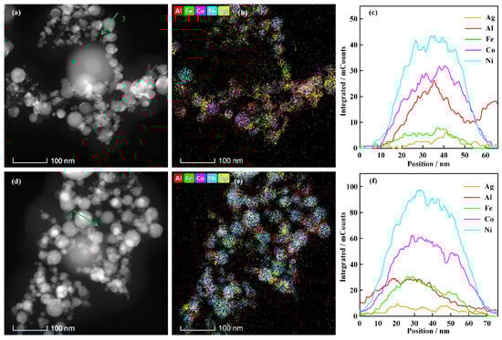 The high-entropy alloys are characterized by random occupation of lattice sites by atoms of each constituent element. They tend to form and maintain solid solutions during alloying. The elemental composition significantly influences the atomic arrangement and lattice parameter of high-entropy alloys [28]. The morphological image and element analysis data for the electrically exploding Sample 2 and Sample 3 are shown in Figure 5. The elemental line scanning data in Figure 5c and Figure 5f is performed along the green arrows in Figure 5a and Figure 5d, respectively. The experimental data from Sample 2 demonstrate that elements of Al, Fe, Co, and Ni distribute uniformly within the nanoparticles, while the Ag element forms the element segregation. The degree of element segregation is less severe than that of Sample 1. The nanoparticles synthesized by the electrically exploding Sample 3 exhibit a homogeneous distribution of all five elements. The contents of Ag and Al elements in nanoparticles are higher than their initial proportions in joint-twisted wires, whereas the contents of Fe, Co, and Ni are lower than their initial proportions. The non-synchronous exploding process might be responsible for the deviation of element contents in nanoparticles from their initial proportions in joint-twisted wires. The explosion time can be estimated by τex~h/j2 [29], in which h is the specific current action integral for heating the wire from the room temperature to the explosion point, and j is the current density. It is estimated that the explosion times for Ag and Al wires are shorter than those of Fe, Co, and Ni wires, with the assumption that the redistribution of current density is primarily determined by the resistivity at the initial stage of the discharge, resulting in a non-synchronous exploding process of individual wires. The Ag and Al wires reach their melting points earlier to eject more submicron droplets to participate in the formation of ME-NPs. The experimental measurement demonstrates that the non-synchronous exploding process exerts no influence on the phase separation of Ag in the nanoparticles. Conversely, the reduced presence of Fe, Co, and Ni elements in the nanoparticles suggests that higher proportions of Fe, Co, and Ni elements are retained in micron-scale droplets.