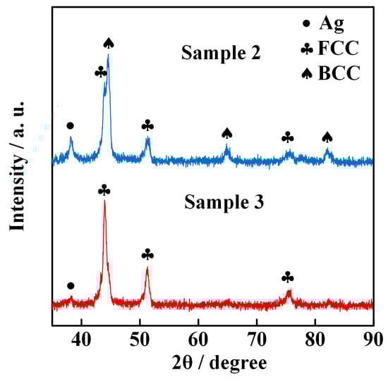 The XRD data of ME-NPs synthesized by the electrically exploding Sample 2 and Sample 3 are shown in Figure 6. The ME-NPs from Sample 2 contain the FCC phase, BCC phase, and Ag phase with corresponding mass fractions of 40.8%, 52.5%, and 6.7%, respectively. In contrast, the ME-NPs from Sample 3 comprise the FCC solid solution with 97.2% in mass fraction and Ag with 2.8% in mass fraction. The phase compositions of the ME-NPs change with the proportion of elements in different configurations of joint-twisted wires. The Al element introduces lattice strain due to its large atomic radius, promoting a transition from an FCC structure to a BCC structure in FeCoNiAl-based high-entropy alloys [30]. The Ag element also possesses a larger atomic radius than that of Fe, Co, and Ni elements. Thus, mixing the Ag element contributes strain energy to overcome the energy barrier between the FCC and BCC structures. The reduction in the total contents of Al and Ag elements in the AgAlFeCoNi nanoparticles drives the change in crystal structure. As the Ag content in the wire load decreases, the Ag element gradually diminishes and eventually almost disappears in the nanoparticles. Thus, the electrically exploding Sample 3 tends to form nanoparticles of a single-phase FCC solid solution.