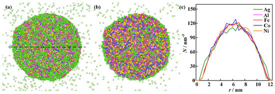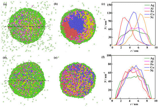 The computational results for the merging of individual single-element nanoclusters described in the first physical scenario at different initial temperatures are shown in Figure 7. The green, purple, red, blue, and yellow spheres represent Ag, Al, Fe, Co, and Ni atoms, respectively. Figure 7a–c are results calculated under the initial temperature of 2000 K. During the process of the nanocluster aggregation, the temperature of the clusters is determined by the interaction between metallic atoms and the argon gas, as well as the released thermal energy converted from the atomic binding energy [40]. One can see that the surface of the nanoparticle is primarily covered by Ag atoms. The elemental distribution curve along the black dashed line reveals that the phase separation within the nanoparticle is outstanding. The energy released during the cluster coalescence provides insufficient driving force for the homogeneous elemental mixing. Thus, the elements of high melting points, such as Fe, Co, and Ni, are distributed unevenly within the nanoparticle. The Ag element with low melting temperature and surface energy moves toward the nanoparticle surface. Increasing the initial temperature enhances the thermal motion of atoms. The computational results under the initial temperature of 3000 K are presented in Figure 7d–f. One can see that the initial temperature exerts a significant influence on the mixing behavior of the clusters. Although the Ag segregation phenomenon is still observed on the surface of the nanoparticle, the homogeneity of Al, Fe, Co, and Ni atoms is greatly improved.