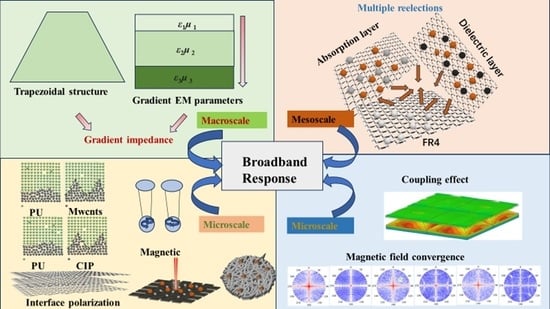 In this configuration, the low concentration of MWCNTs (0.5%) in the outer layer improves electromagnetic wave transmittance, while the high concentration of CIP (83.3%) in the inner layer enhances magnetic loss, thereby resolving the impedance mismatch problem commonly associated with single-mechanism loss systems.