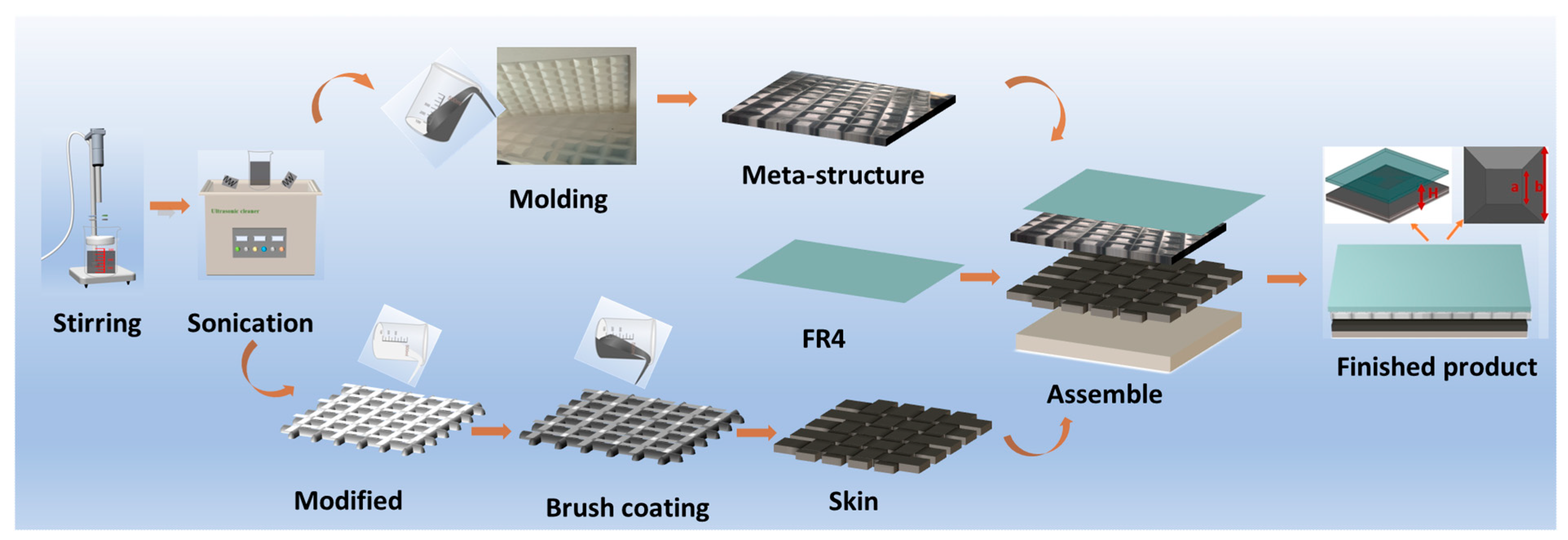 The skin layers were fabricated by stacking and curing the prepared prepregs. Within the skin structure, the embedded fiber cloth serves as the impedance matching layer, while the applied wave-absorbing adhesive acts as the functional coating responsible for electromagnetic absorption. The fiber cloth not only reinforces the structural integrity but also supports layered architecture, thereby enhancing the mechanical strength and facilitating multiple internal wave reflections and absorption.