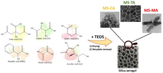 - Pang, J.B.; Qiu, K.Y.; Wei, Y. Preparation of Mesoporous Silica Materials with Non-Surfactant Hydroxy-Carboxylic Acid Compounds as Templates via Sol–Gel Process. J. Non-Cryst. Solids 2001, 283, 101–108. [Google Scholar] [CrossRef]