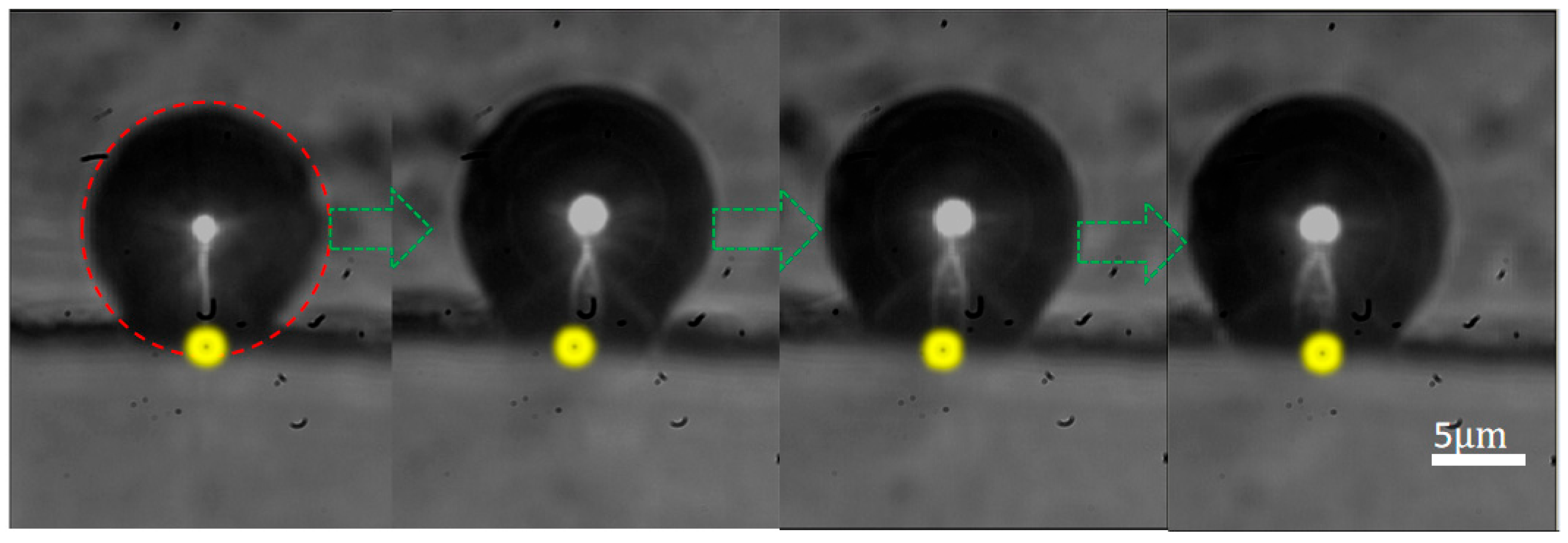 3.2. Laser-Controlled Microbubble Roiling Motion Within a Microchannel Chip