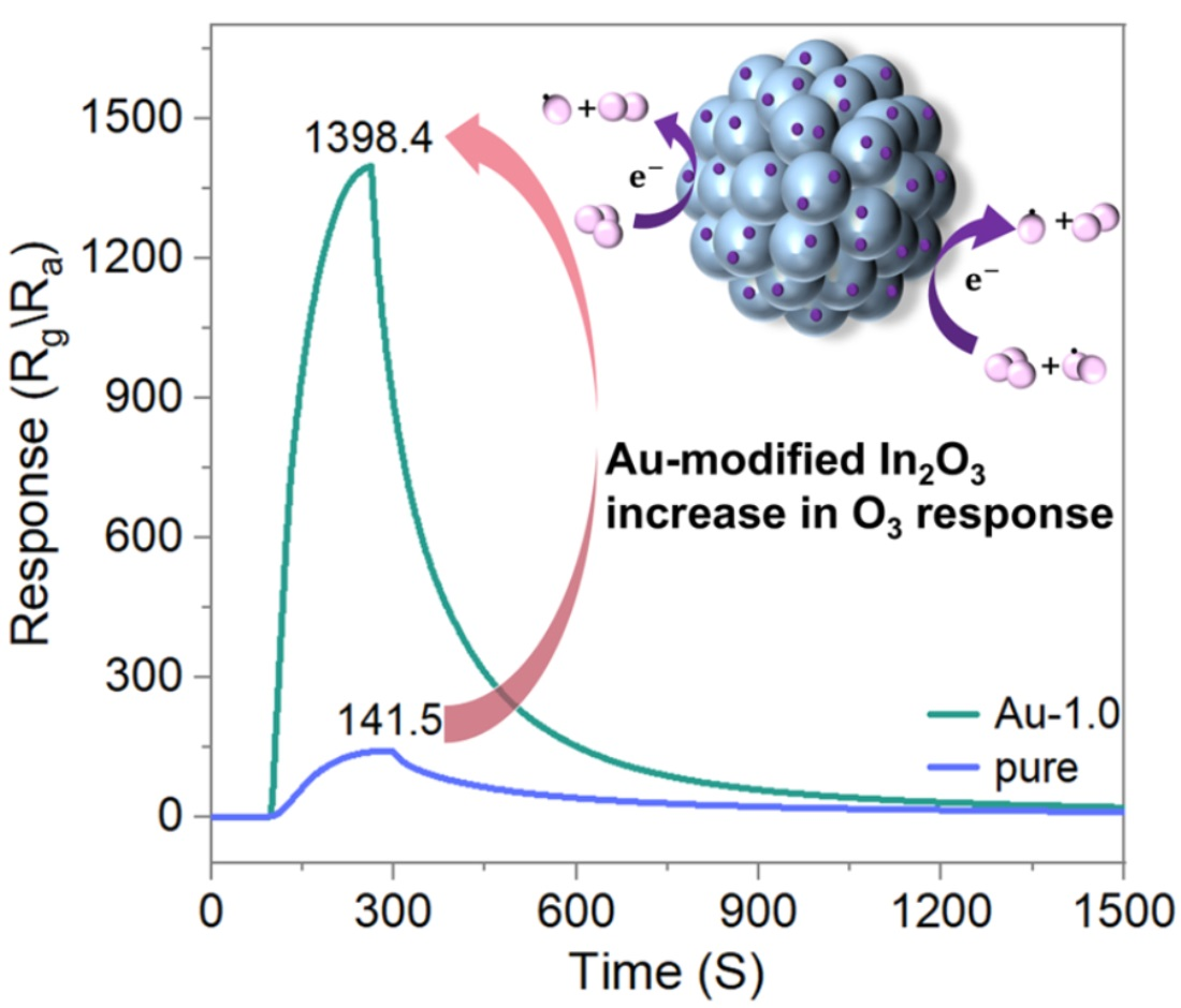 In summary, Au-modified In2O3 cauliflower-like nanostructures were successfully synthesized through a hydrothermal process followed by a chemical reduction method. XRD, SEM, and TEM characterizations confirmed that Au nanoparticles were uniformly dispersed on the surface of the In2O3 cauliflower. Gas-sensing measurements revealed that the sensor with 1.0 wt% Au modification exhibited the highest response of 1398.4 toward 1 ppm O3 at room temperature, which is approximately 10 times higher than that of pristine In2O3. The enhanced O3 sensing performance can be reasonably attributed to the combined effects of charge transport controlled by grain boundary potential barriers and the formation of Au-In2O3 interfacial Schottky junctions, which together amplify the resistance variation induced by O3 adsorption. In addition, the hierarchical porous architecture is beneficial for gas diffusion, while the catalytic spillover effect of Au nanoparticles facilitates oxygen activation and interfacial charge transfer. These results indicate that regulating grain boundary barriers and metal-semiconductor interfacial electronic structures is an effective strategy for developing high-performance room-temperature O3 gas sensors.