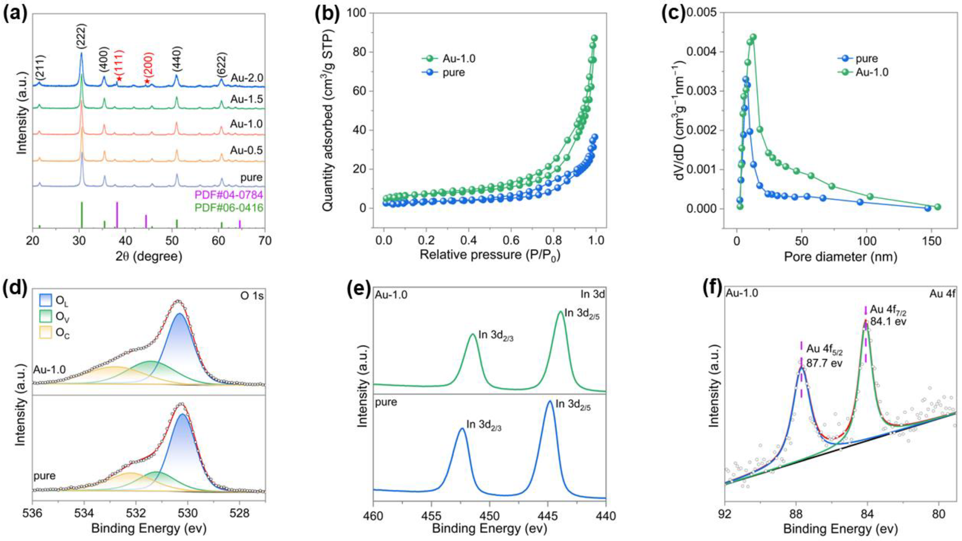 Figure 2. (a) XRD patterns of the samples. (b) N2 adsorption–desorption isotherms and (c) BJH pore-size distribution of pure and Au-1.0. XPS spectra of: (d) O 1s, (e) In 3d3/2 and 3d5/2, and (f) Au 4f for the corresponding samples.